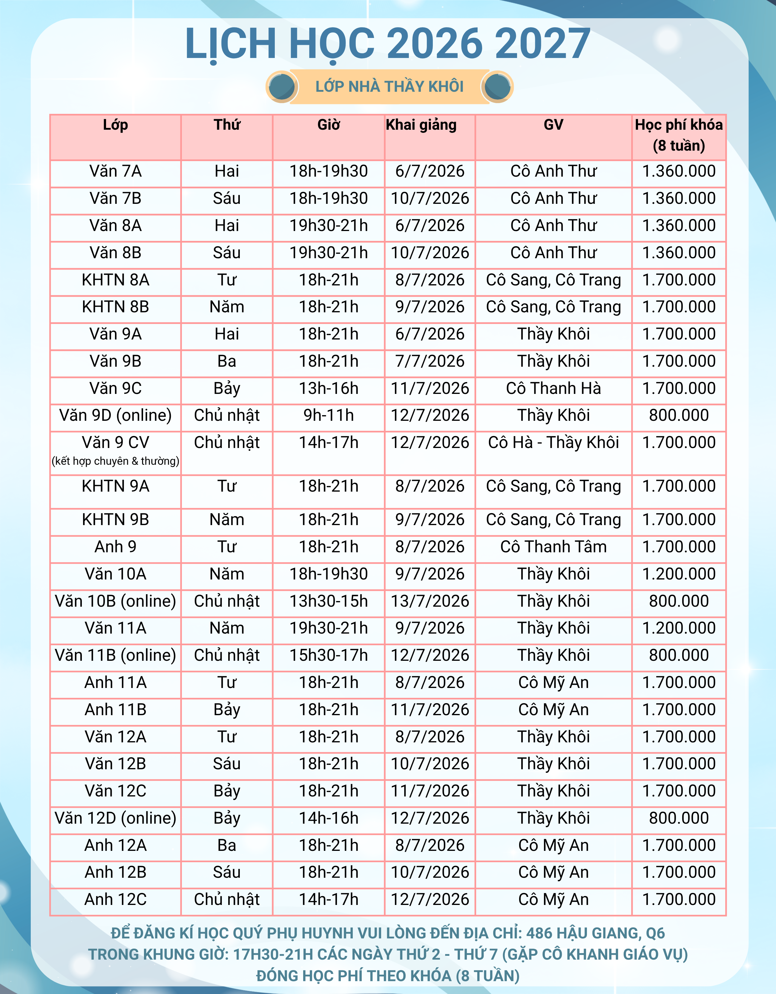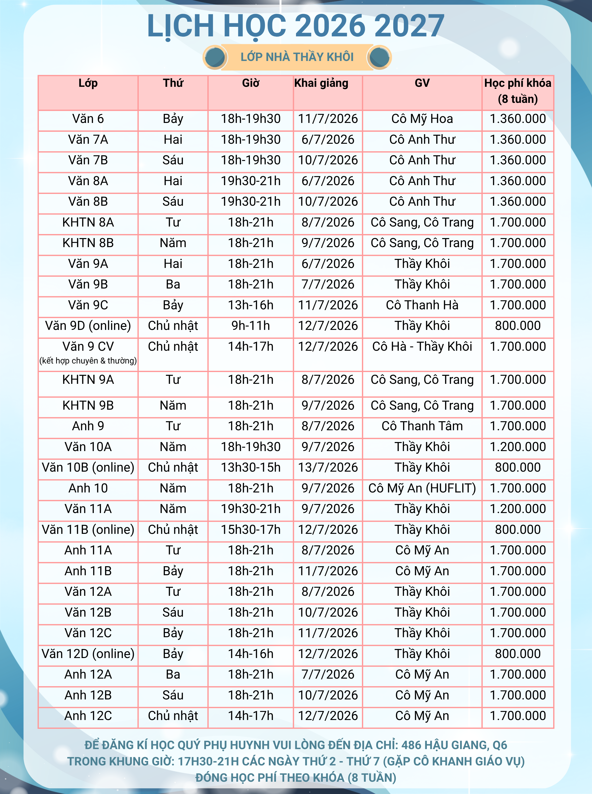 Tổng hợp các lớp học tại trung tâm thầy Khôi – 486 Hậu Giang, Q6