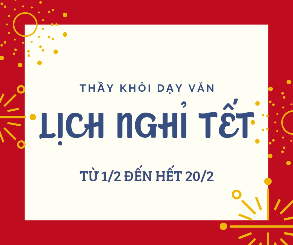 LỊCH NGHỈ TẾT CHÍNH THỨC CỦA THẦY KHÔI DẠY VĂNDo một số biến động, thầy quyết định cho các bạn đang học nhà thầy nghỉ tết sớm 1 tuần. Chúng ta bắt đầu nghỉ từ thứ 2, ngày 1/2/2021, cho đến hết ngày thứ 7, 20/2/2021.Tất cả các lớp đi học lại từ chủ nhật 21/2/2021 [có trà sữa và lì xì!]Chúc các bạn nghỉ tết vui vẻ, mạnh khỏe ^^Thầy Khôi dạy Văn.