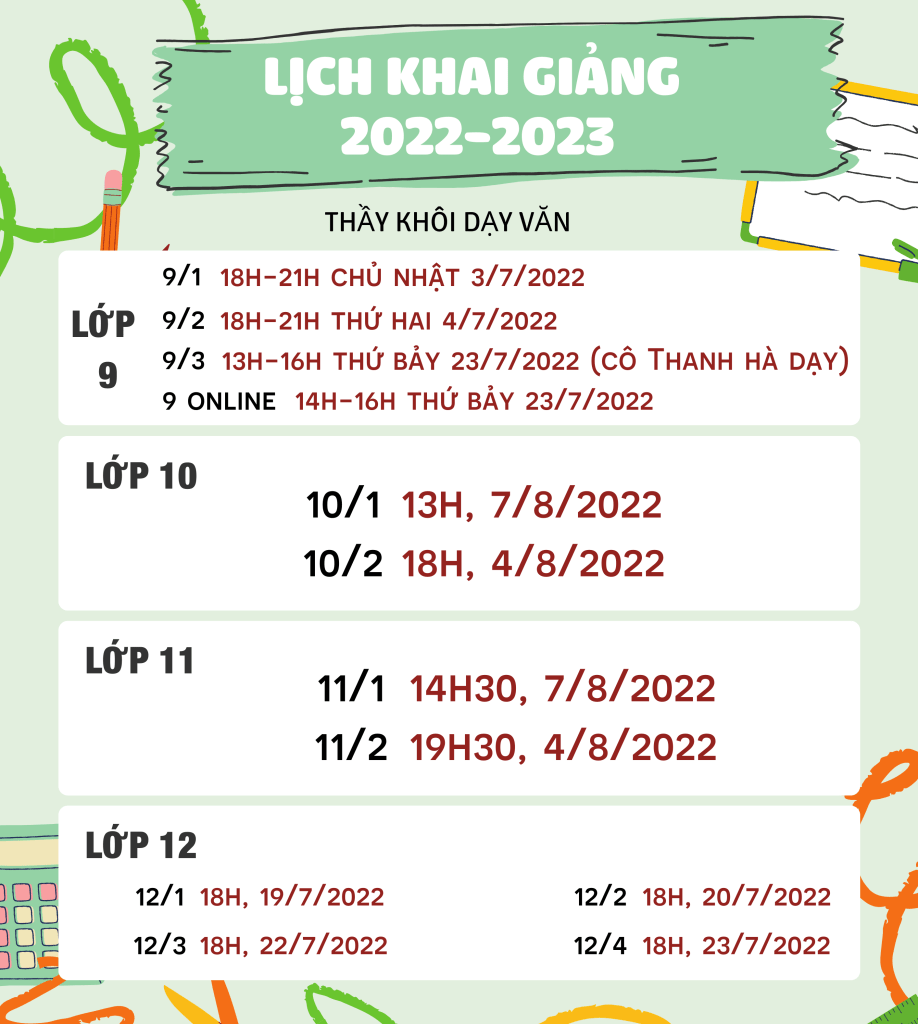 – Lớp Văn 11/1 bắt đầu học vào 14h30-16h chủ nhật, 7/8/2022
