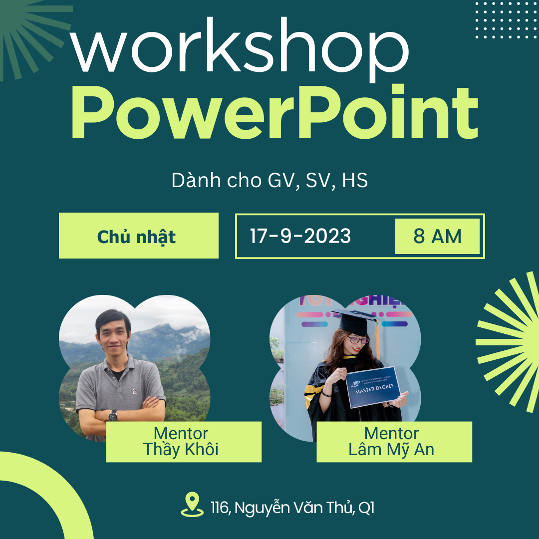 Trong buổi này, các mentor sẽ hướng dẫn quý thầy cô, các bạn học sinh, sinh viên các hiệu ứng bắt mắt nhưng dễ làm, gây ấn tượng tốt với người xem; hướng dẫn nơi tìm kiếm các nguồn tài nguyên để thiết kế bài trình chiếu; và thực hành tại chỗ theo cách cầm tay chỉ việc.