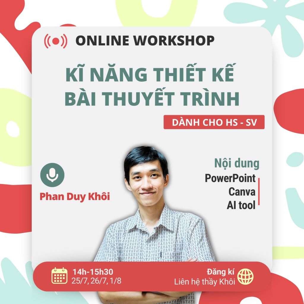 – Nội dung: kĩ thuật trình chiếu PowerPoint từ cơ bản đến nâng cao, kết hợp các công cụ như Canva, AI tool để bài trình chiếu thêm sinh động, thuyết trình hiệu quả hơn.