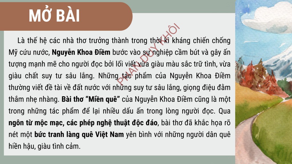 - Đề: Viết đoạn văn phân tích vẻ đẹp miền quê được thể hiện trong bài thơ Miền quê Nguyễn Khoa Điềm)