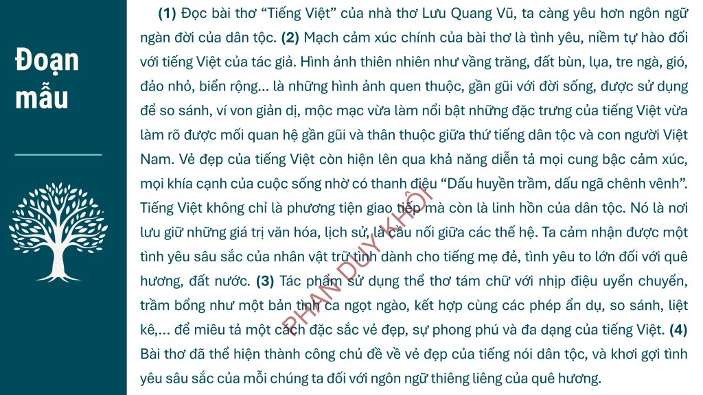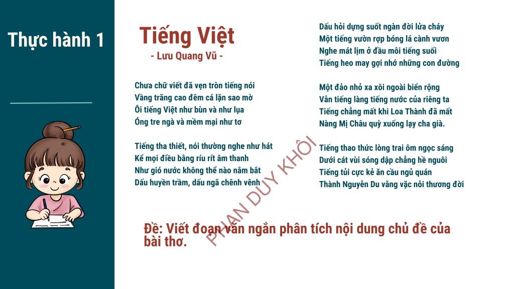 - Đề: Viết đoạn văn phân tích chủ đề bài thơ Tiếng Việt (Lưu Quang Vũ)