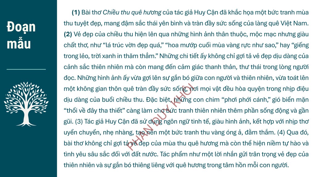 - Đề: Viết đoạn văn phân tích vẻ đẹp của hình ảnh chiều thu được thể hiện trong bài thơ Chiều thu quê hương (Huy Cận)