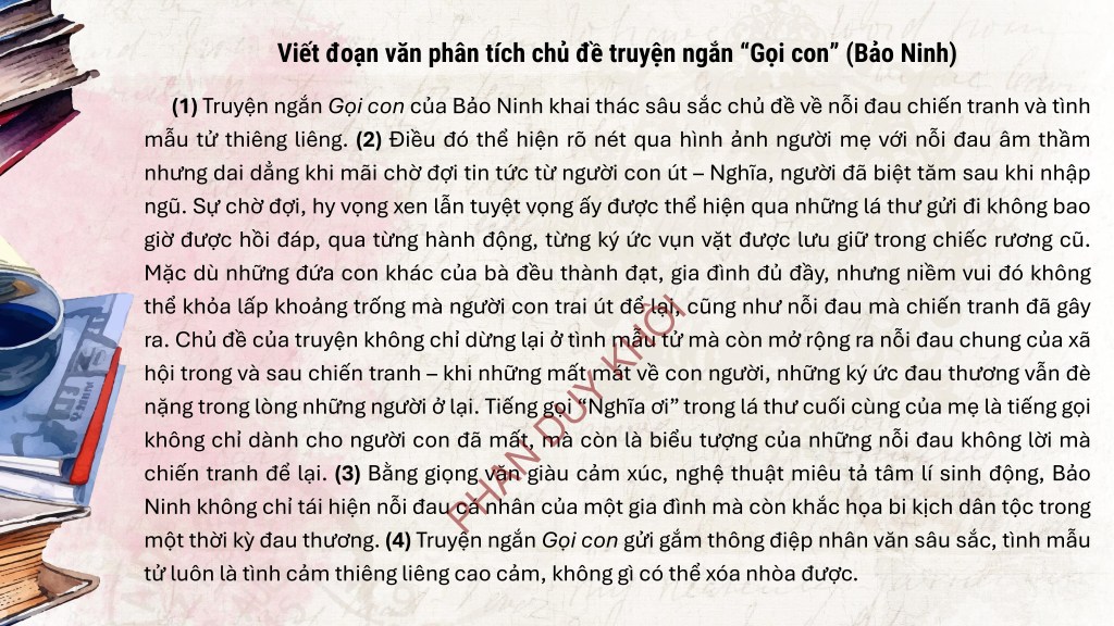 - Đề 10: Viết đoạn phân tích chủ đề của truyện ngắn Gọi con (Bảo Ninh)