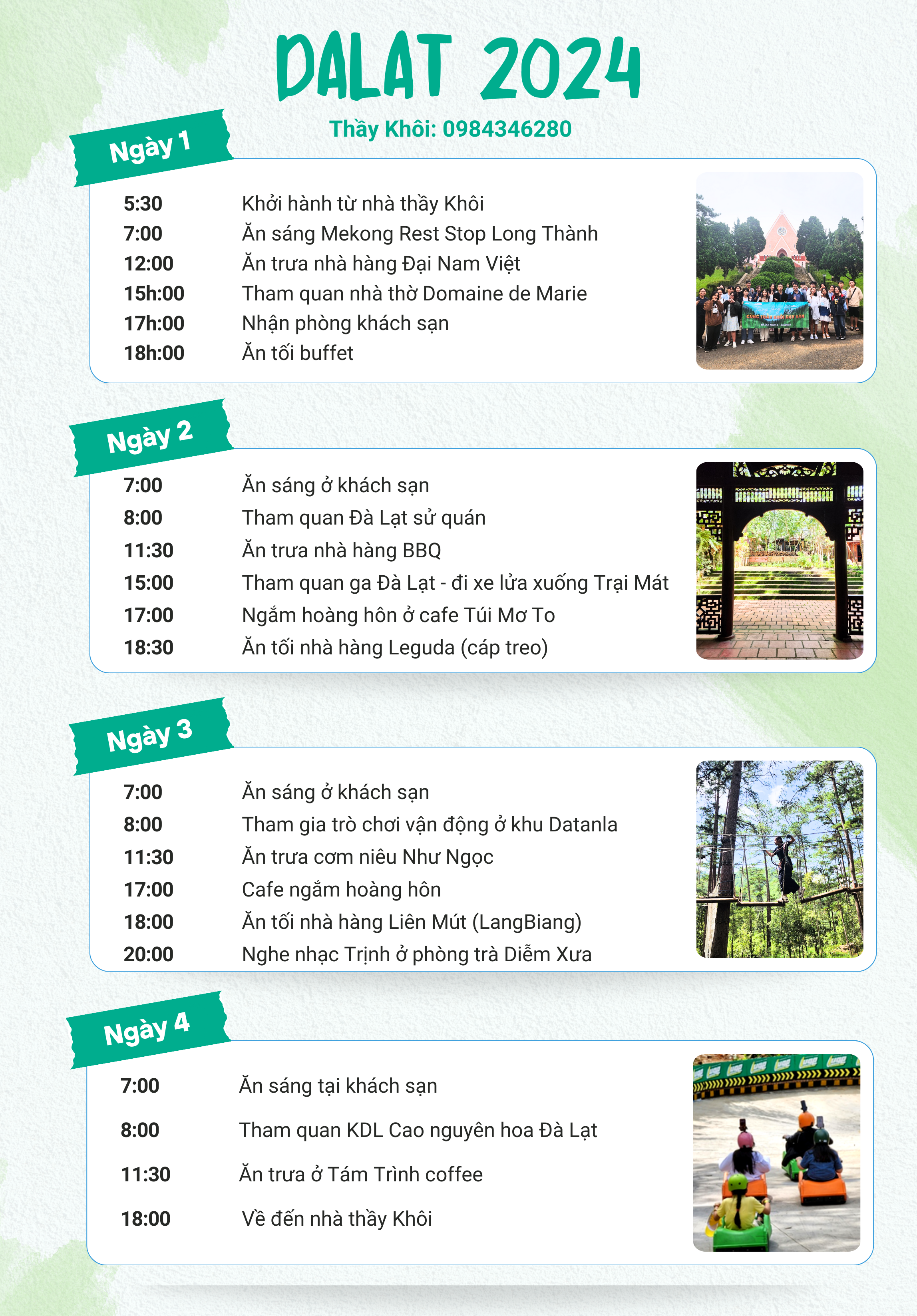 Thầy Khôi dạy Văn tổ chức chuyến du lịch Đà Lạt năm 2024 từ ngày 1 đến ngày 4 tháng 7/2024 (4 ngày 3 đêm) dành cho tất cả học sinh, cựu học sinh của thầy Khôi (mọi môn học), cho phép dẫn bạn bè, anh chị em theo. Chỉ dành cho 38 bạn đăng kí sớm nhất.